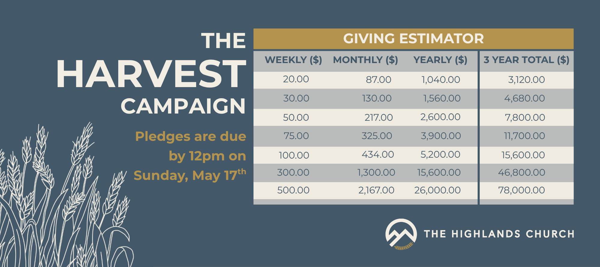 Join us at 6:00 PM for a special Harvest Service, where we will worship together and announce the number of total pledges received.